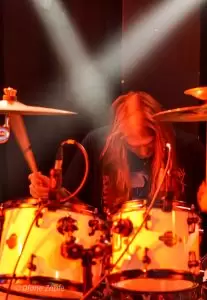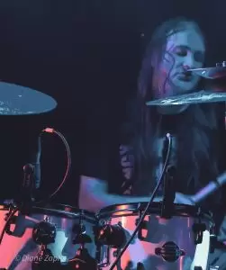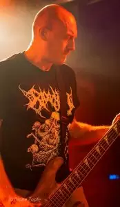 Die Vorband Bloodjob aus Gießen heizte den zahlreich erschienen Gästen ordentlich ein. Die Band steht seit 2007 für kompromisslosen Brutal Death Metal, der technisch versiert und aggressiv daherkommt. Mit im Gepäck hatten sie Songs von ihren beiden Demos, dem Album „Sick Concept Humanity“(2019) und der aktuellen EP “ Metastasis“(2023). Sänger Sascha Kaiser liefert Growls im Stil von Benighted ohne die Pigscreams. Mit überraschend hoher Sprechstimme fragte er nach einem Bier, dass ihm jemand schließlich brachte, während ein anderes Bier über mir verteilt wurde. Prost. An der Gitarre überzeugte Olli mit präzisen Riffs, Robert hielt den Bass wuchtig im Hintergrund, und Hannes Koch (auch aktiv bei SUN EATER) lieferte am Schlagzeug eine beeindruckende Show ab. Einmal verhedderte sich tatsächlich ein Drumstick in seiner wunderschönen langen Mähne – kann passieren. Bloodjob zeigten eindrucksvoll, dass Brutal Death Metal nicht nur hart, sondern auch unterhaltsam sein kann – ein starker Auftakt für den Abend.