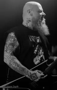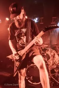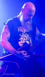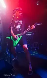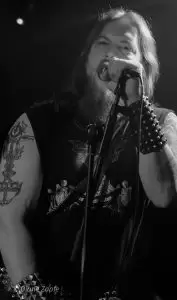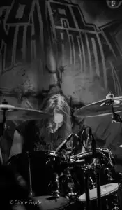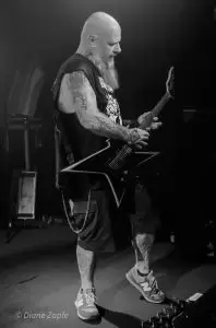 Davon profitierte natürlich sofort die Vorband, die extrem gut ablieferte. Total Annihilation aus Basel/Schweiz haben mit ihrer Mischung aus Thrash- und Death-Metal die Bühne regelrecht zerlegt. Seit 2006 aktiv und mit dem zuletzt erschienen Album …On Chains Of Doom(2020) unterwegs, zeigten sie eindrucksvoll, dass sie weit mehr sind als ein Opener. Daniel Altwegg brüllte sich die Seele aus dem Leib, während Nicolas Stelz an der Leadgitarre mit messerscharfen Soli glänzte. Jürgen Schmid und Niggi Denger lieferten das groovende Fundament, doch das wahre Kraftwerk saß hinterm Schlagzeug: Michael Lautenschläger. Leider kaum sichtbar hinter seinem wuchtigen Drumkit. So sehr, dass ich ihn nach der Show um ein paar Fotos direkt am Set bat. Total Annihilation haben den Abend nicht nur eröffnet, sie haben ihn überrollt. Die Zugabe gab es bei Krach aus dem Publikum – kein Problem. So wurde noch das schnelle und harte „The Art of Torture“ geknüppelt. Applaus und Gejubel.