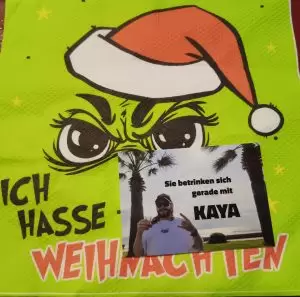Bei der Außentemperatur von frostigen Graden schnell in die kuschelige Goldgrube Kassel hinabsteigen. Masters of Cassel gibt es nun schon seit 20 Jahren und die Weihnachtsedition fand dieses Jahr in der Goldgrube statt. Die Hütte war gut besucht und so merkte man nichts von der arktischen Kälte. Zuerst hat mich Diana Schneider begrüßt, der weibliche Teil des Master of Cassel Team, während Kollege und Ehemann Dirk Schneider die Stellung am Merchstand hinter der Theke hielt. Sie drückte mir die herrliche Grinchserviette „Ich hasse Weihnachten“ in die Hand, weil ich ganz begeistert von Kayas Antichristus Pullover war. Der wurde von Diana zu mir zitiert, da ich beim letzten Besuch die Verschlußkappe meiner Kamera verbaselt hatte, die sich Gott sei dank in der Kramkiste wiederfand. Daraufhin ein Bierchen mit Kaya Knorke, der mir nicht nur die erfrischende Hopfenschorle spendierte, sondern mir auch sein persönliches Kärtchen „Sie betrinken sich gerade mit Kaya“ ins Händchen drückte. Gut, falls mal nach dem x-ten Bierchen den Namen vergisst, einfach nochmal nachschauen.