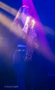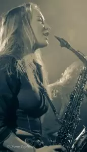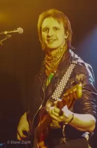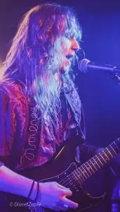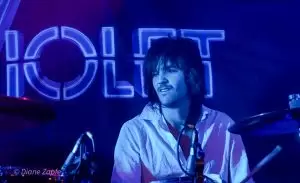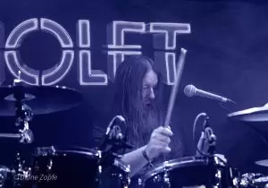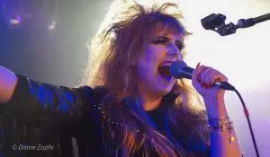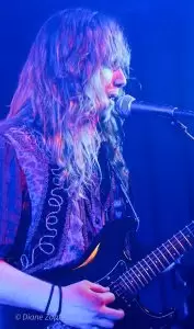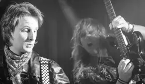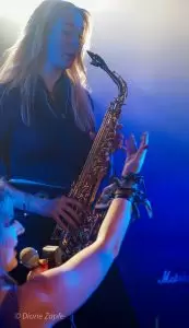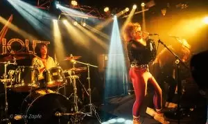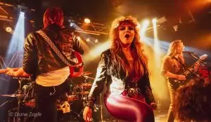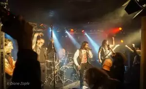 …und so startete der Abend ruhig und in bester Gesellschaft. Heiko und Markus hatten auch mal wieder den Weg nach Kassel gefunden, aber nur Markus sollte gefallen, was nun kam. VIOLET, eine 80ziger Jahre Glam, Rock, Heavy, Pop – ich weiß nicht was – Band mit Frontfrau. Die Fans standen direkt hinter mir und gaben die Songs ungebeten in einem schrägen Gekrächze von sich, während sich die Band auf der Bühne vorbereitete. Auch auf freundliche Hinweise, man möge die Songs doch lieber im Original von der Sängerin vorgetragen haben, kam nur, man wäre eh schon zu besoffen. So konnte man nur anstoßen und ein Bierchen mittrinken. PROST! Das Outfit der Band stammte auf jeden Fall 1:1 aus den 80ziger Jahren. Sängerin Jamie führte das Set an und stand in permanenter Interaktion mit dem Publikum. In Markus hatten sie auch einen neuen Fan gefunden, der sich nicht nur ein Bandshirt kaufte, sondern uns stolz das Selfie mit der Sängerin zeigte.